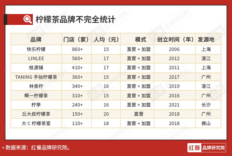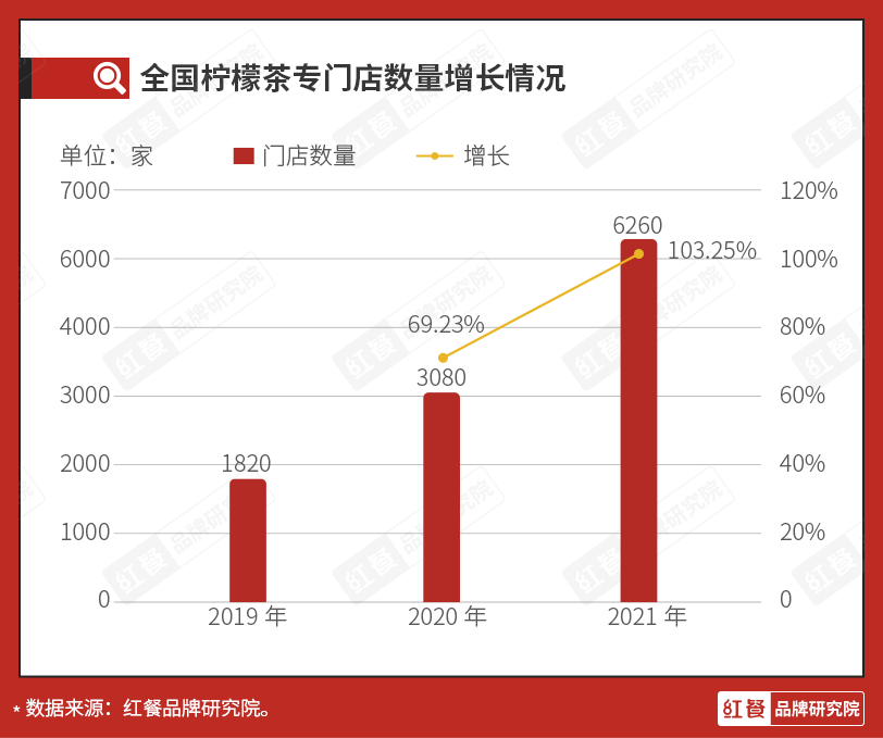 伴隨著檸檬茶品類的熱度高漲起來,檸檬茶代表品牌們也進入了發展快車道。紅餐品牌研究院預估,2021全國檸檬茶專門店數量有望超過6000家,而這一數值在2020年還只是3000多家。與此同時,2021年檸檬茶市場規模預計在百億元以內。