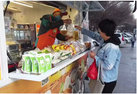 從北京來烏魯木齊市旅游的馮春麗,拉著行李箱前來購買早餐。“3月31日來到烏魯木齊,在市區里轉了兩天,今天準備去一些景區。這樣的早餐車看著簡單,其實內容豐富,昨天早上來嘗了新疆特色的馕,味道不錯。”馮春麗說:“這樣的早餐車干凈衛生,老板介紹說,餐品是公司統一配送有保障,吃著放心。我剛買了一杯小米粥和一個油香,味道不錯,粥濃稠剛好,油香不油不膩,才花了4元錢,太劃算了。”
