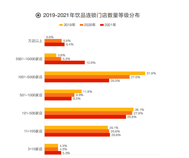 而茶飲品牌連續三年位居高位,其中茶百道、蜜雪冰城、書亦燒仙草、古茗、阿水大杯茶進入榜單前十。截止2021年,該品類連鎖已經突破40%。從數據上看,2021年飲品門店數占比最多的區間為101-500家規模區間內,占比達25%;其次是11-100家和1001-5000家規模區間內,占比均為20%。從變化趨勢來看,茶飲類5000至萬店規模的連鎖加盟門店數占比由3.8%增長到12.9%;除此外,3-10家和11-100家規模區間的品牌門店數占比呈現上漲趨勢,小規模品牌逐步開始追趕市場的發展。