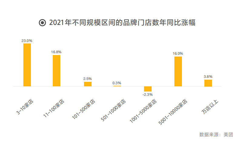從2019年到2021年三年期間,中國餐飲市場的連鎖化率從13%增長到了18%,其中連鎖門店漲幅最高的分別是3-10家店的23.0%、11-100家店的16.8%和5001-10000家店的16.0%,由此可以看出,中國餐飲市場的連鎖化還在加速中。